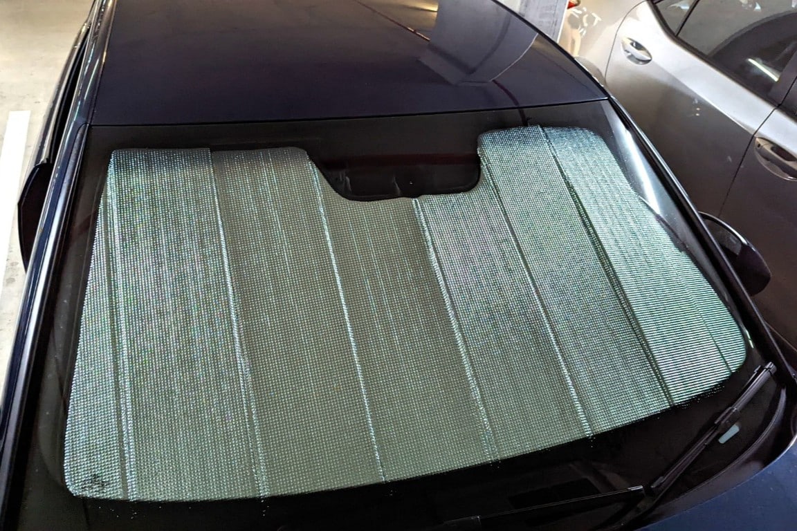 Note: Our custom sun shades block out a significant amount of light and UV rays that enter from the front windscreen, however due to the angle of the front windscreen and additional sensors or different mirror shapes/sizes available for different models, there may be slight gaps around your rear-view mirror or sides to allow the sun shade to fit.