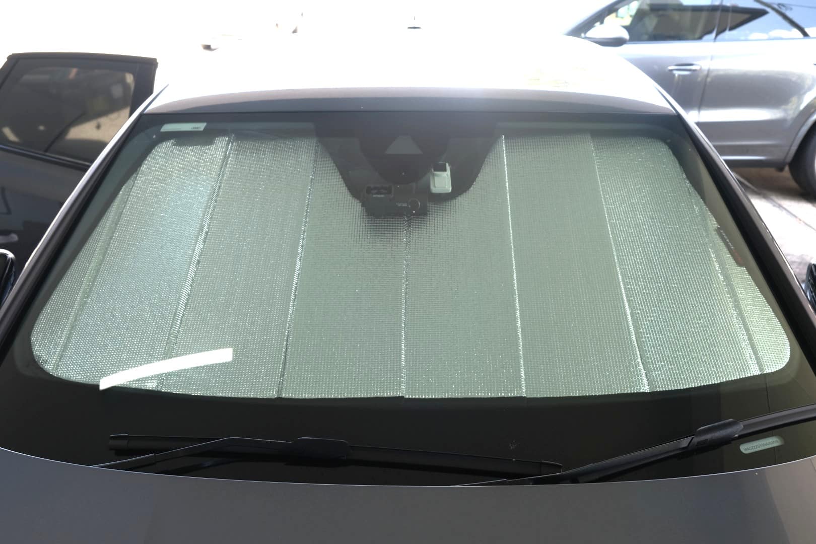 Note: Our custom sun shades block out a significant amount of light and UV rays that enter from the front windscreen, however due to the angle of the front windscreen and additional sensors or different mirror shapes/sizes available for different models, there may be slight gaps around your rear-view mirror or sides to allow the sun shade to fit.