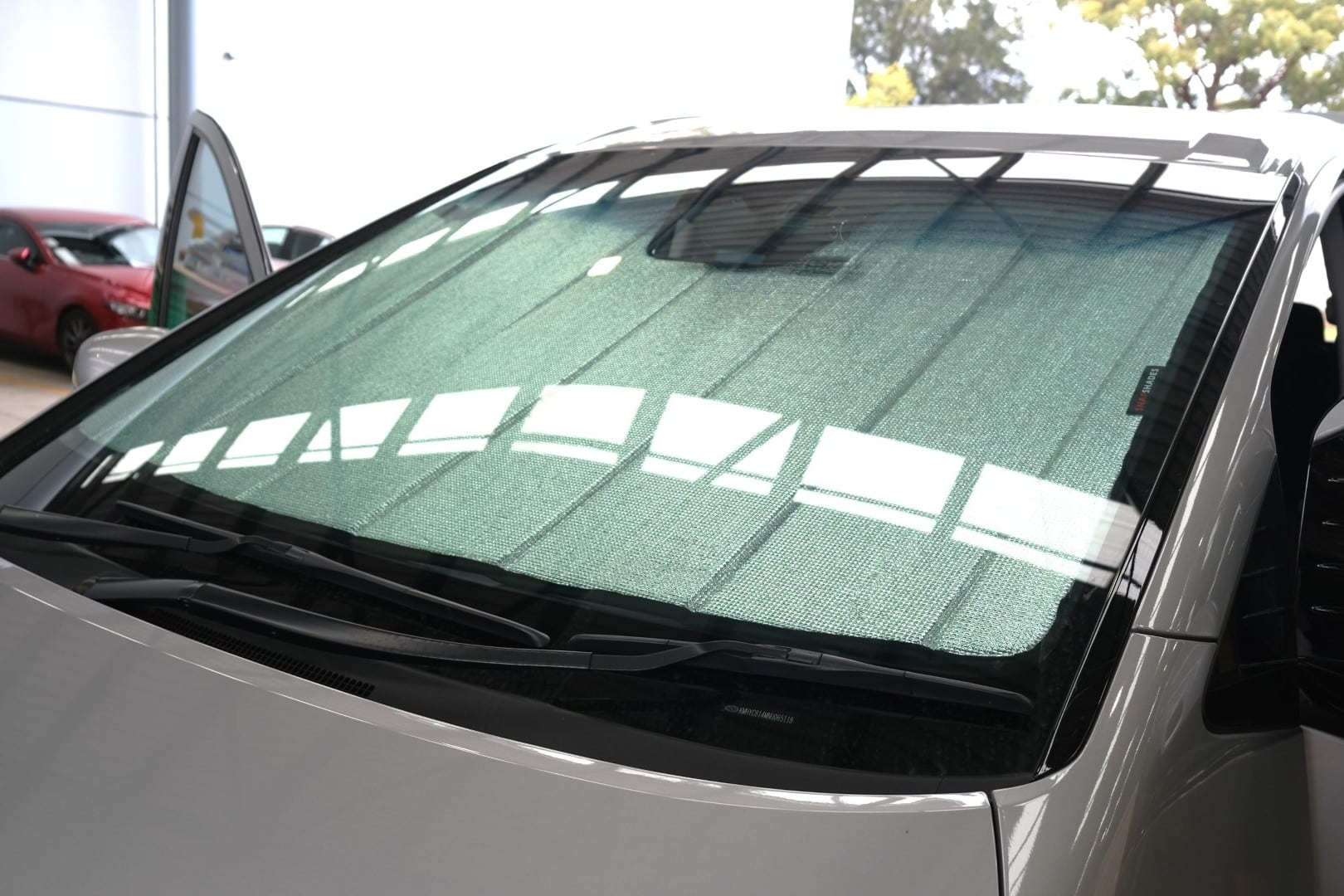 Note: Our custom sun shades block out a significant amount of light and UV rays that enter from the front windscreen, however due to the angle of the front windscreen and additional sensors or different mirror shapes/sizes available for different models, there may be slight gaps around your rear-view mirror or sides to allow the sun shade to fit.
