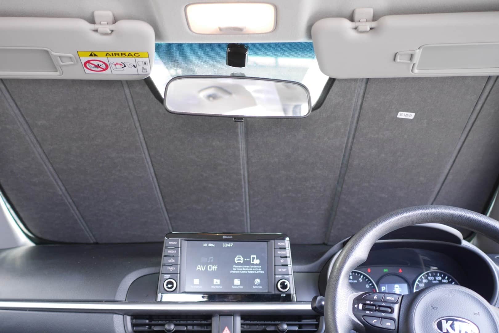 Note: Our custom sun shades block out a significant amount of light and UV rays that enter from the front windscreen, however due to the angle of the front windscreen and additional sensors or different mirror shapes/sizes available for different models, there may be slight gaps around your rear-view mirror or sides to allow the sun shade to fit.
