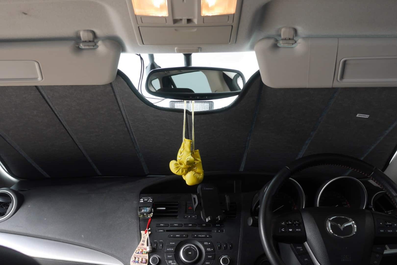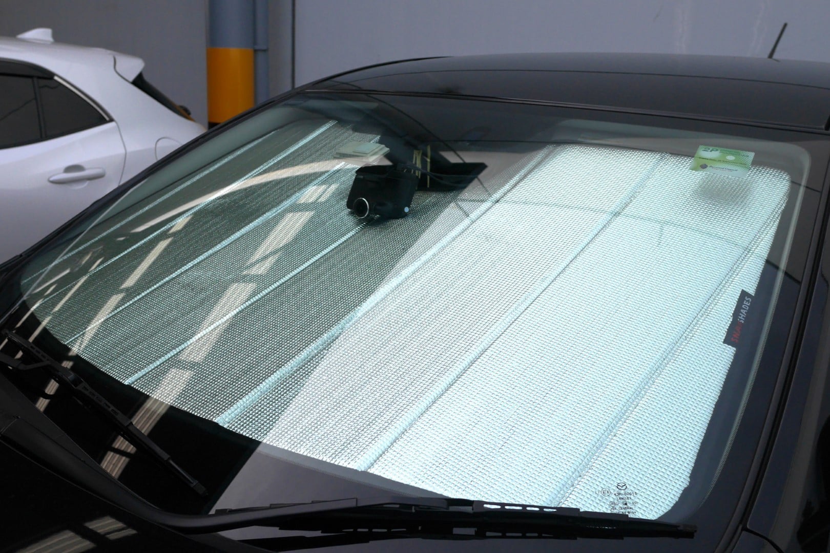 Note: Our custom sun shades block out a significant amount of light and UV rays that enter from the front windscreen, however due to the angle of the front windscreen and additional sensors or different mirror shapes/sizes available for different models, there may be slight gaps around your rear-view mirror or sides to allow the sun shade to fit.