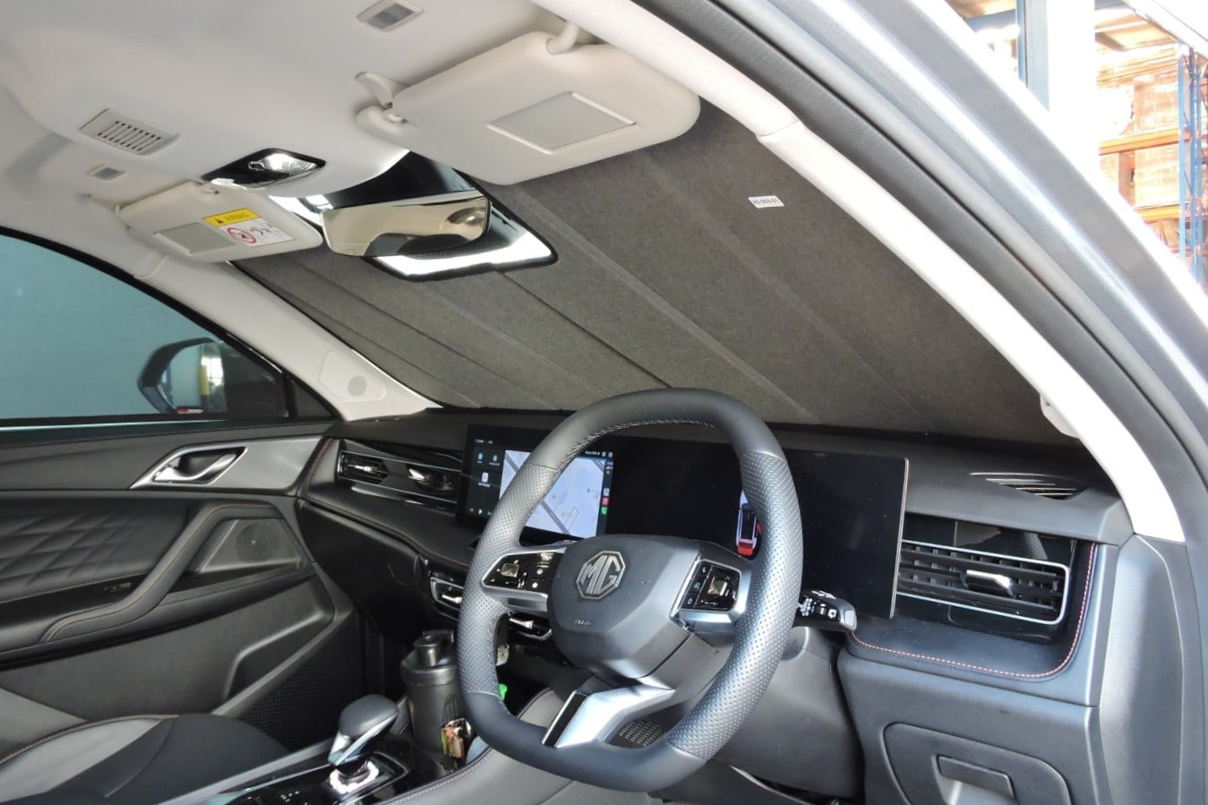 Note: Our custom sun shades block out a significant amount of light and UV rays that enter from the front windscreen, however due to the angle of the front windscreen and additional sensors or different mirror shapes/sizes available for different models, there may be slight gaps around your rear-view mirror or sides to allow the sun shade to fit.