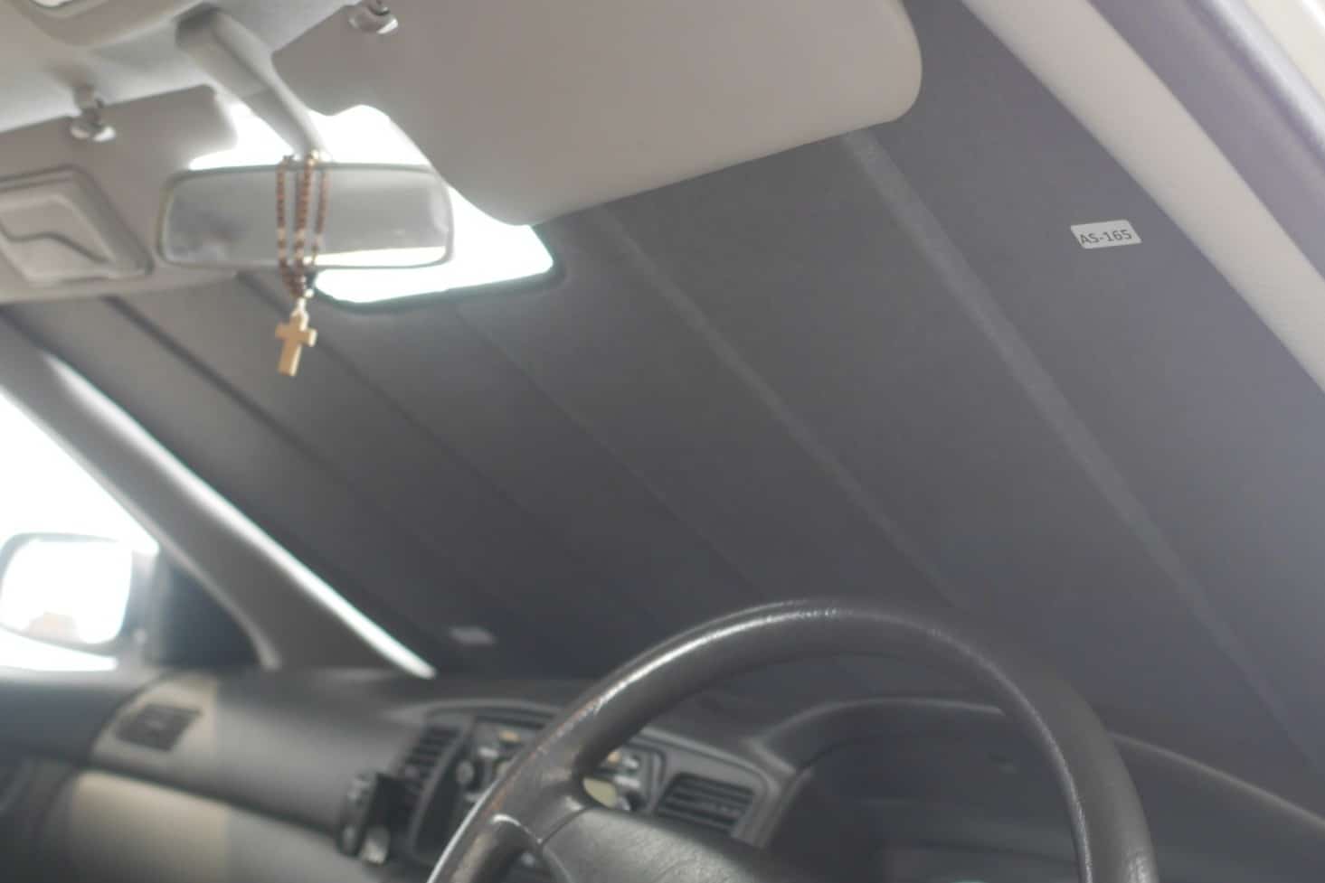 Note: Our custom sun shades block out a significant amount of light and UV rays that enter from the front windscreen, however due to the angle of the front windscreen and additional sensors or different mirror shapes/sizes available for different models, there may be slight gaps around your rear-view mirror or sides to allow the sun shade to fit.