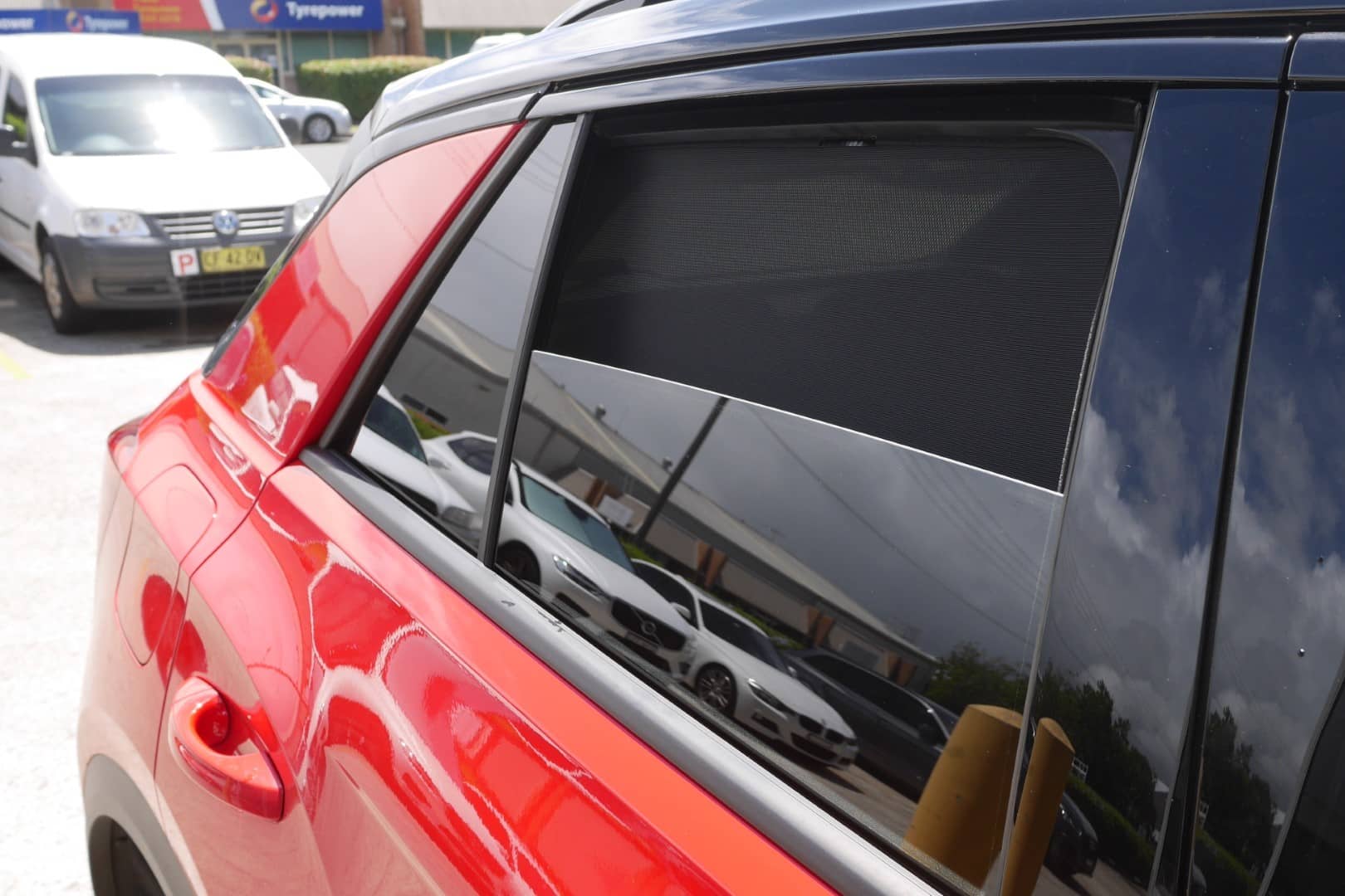 Note: Our custom sun shades block out a significant amount of light and UV rays that enter from the front windscreen, however due to the angle of the front windscreen and additional sensors or different mirror shapes/sizes available for different models, there may be slight gaps around your rear-view mirror or sides to allow the sun shade to fit.